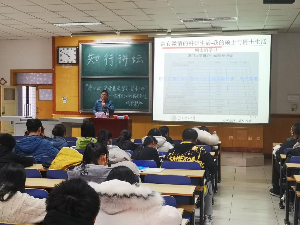朱老师首先表明了自己是中北化工人,拉近了和同学们的距离,然后从知行合一出发,激情而生动跟同学们分享了自己从本科到博士的学习经历和成长历程,言语之间表达了自己对中北的热爱和感激,同时鼓励同学们努力奋斗。“一定要学习”、“一定要认真学习”,这两句话是朱老师在讲座中说的最多的话,这是他发自内心对同学们学习态度的告诫,他还勉励我们做“爱中北,爱专业,爱学习,爱科研”的大学生,将来为社会做出贡献。