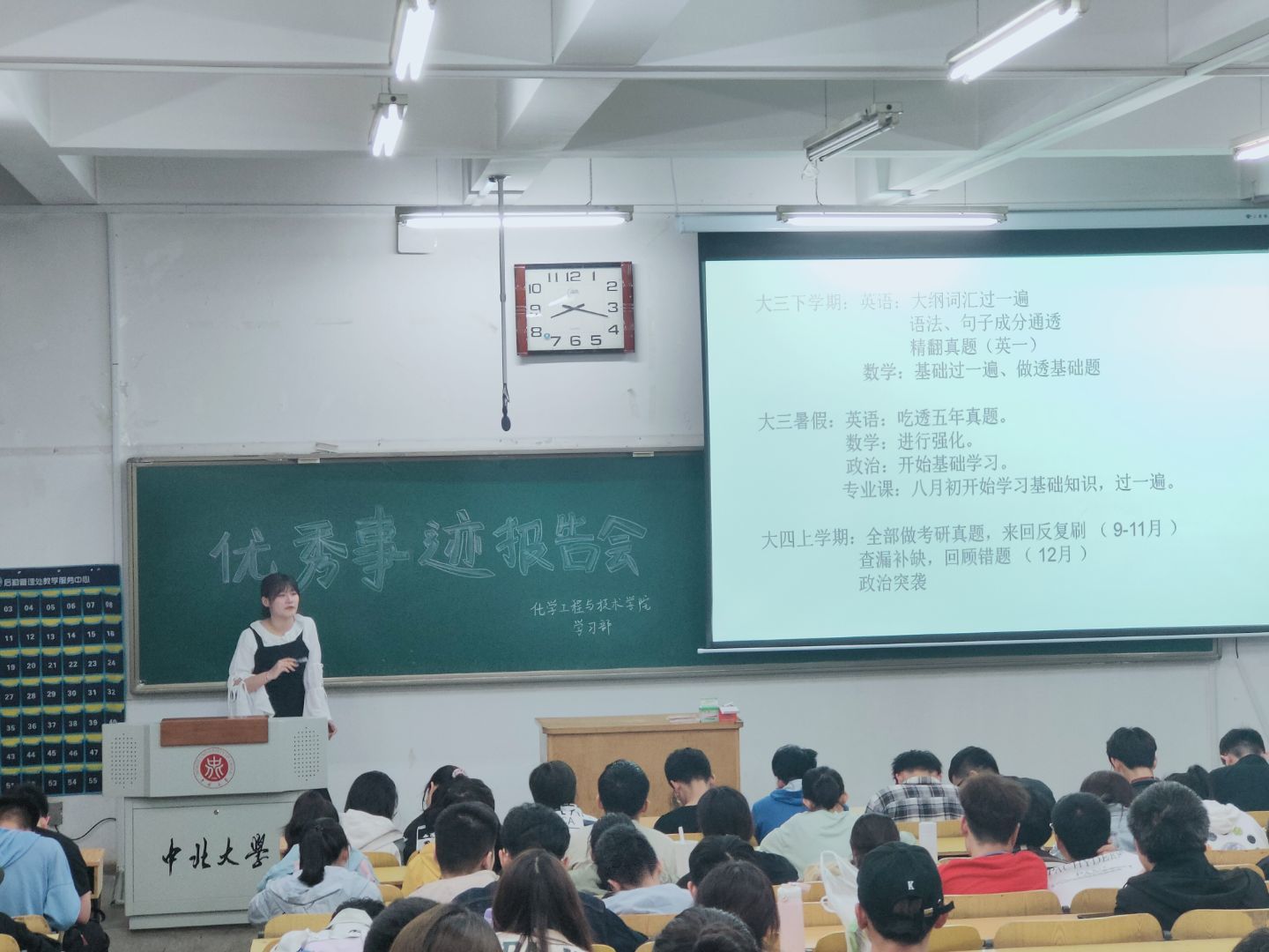 随着优秀事迹报告会的开始,优秀学长学姐们依次上台分享经验。来自化学工程与工艺专业的大四学姐霍欣怡,通过自己的不懈努力,赢得了珍贵的保研机会:“乞火不若取燧,寄汲不若凿井”只有行动才是通往成功的道路上唯一的光,她希望学弟学妹们定要只争朝夕,不负韶华。第二位报告人同样是来自本国产大奶的大四学姐吕佳义,与霍欣怡学姐不同的是,她先通过视频为同学们阐述了“人生不止于悲喜,不负青春不负己”的道理,然后将考研的流程为大家娓娓道来。人而不学,其犹正墙面而立。治学如苦海泛舟,希望同学们也能遇见与自己同舟共济的伯牙子期。之后分享的是来自特种能源技术与工程专业的刘睿学长。他从考研的成绩大的要求讲起,分析了在大学中参加各项竞赛对考研的助力,也介绍了自己对考研与就业的取舍。可谓“听君一席话,胜读十年书”!