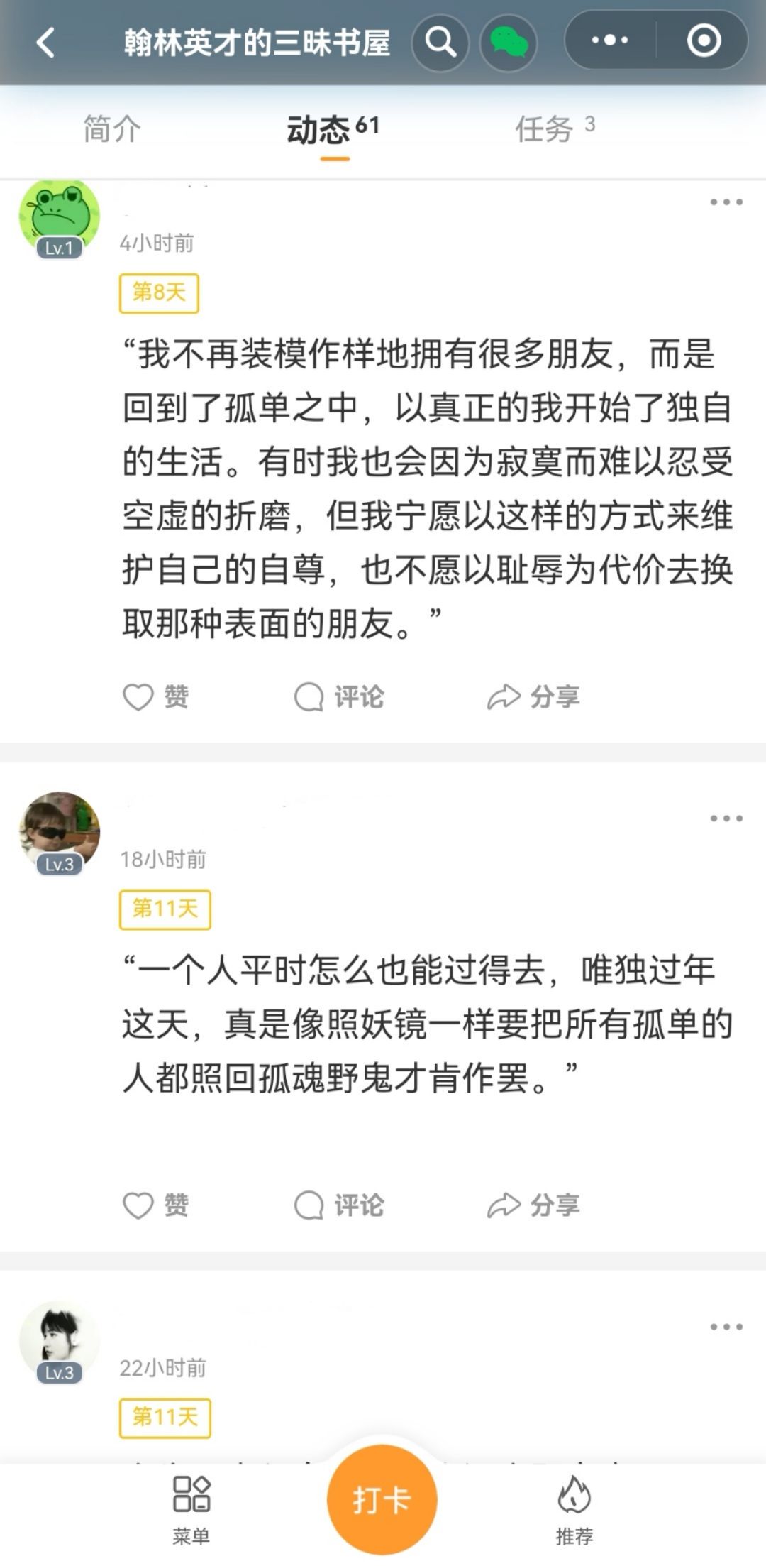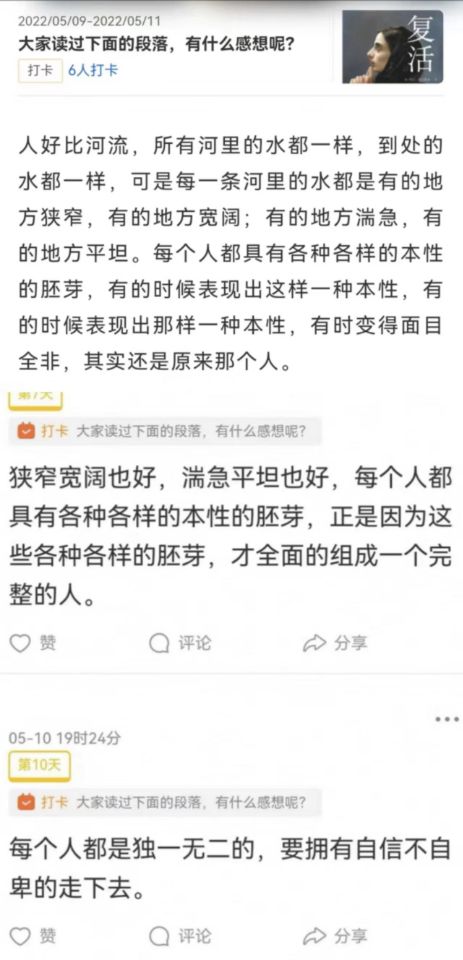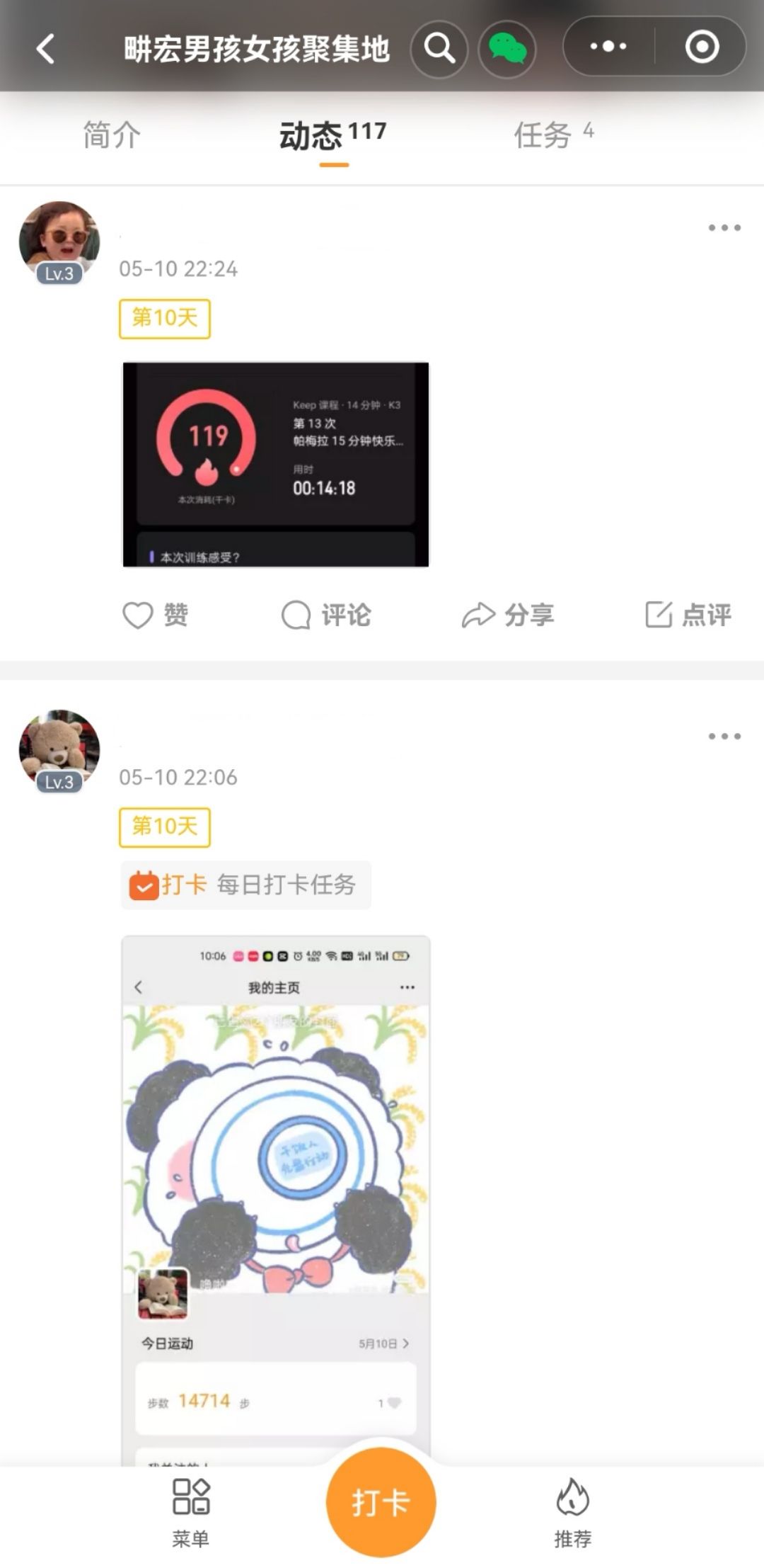 本次活动得到了较好的反响,参与的同学积极发表个人动态,完成相应打卡圈内的集体任务,可以说是真正的感受到了坚持的重要意义,相信参与本次活动的同学们能够将“坚持”这一品质充分运用到未来的学习和生活中去。