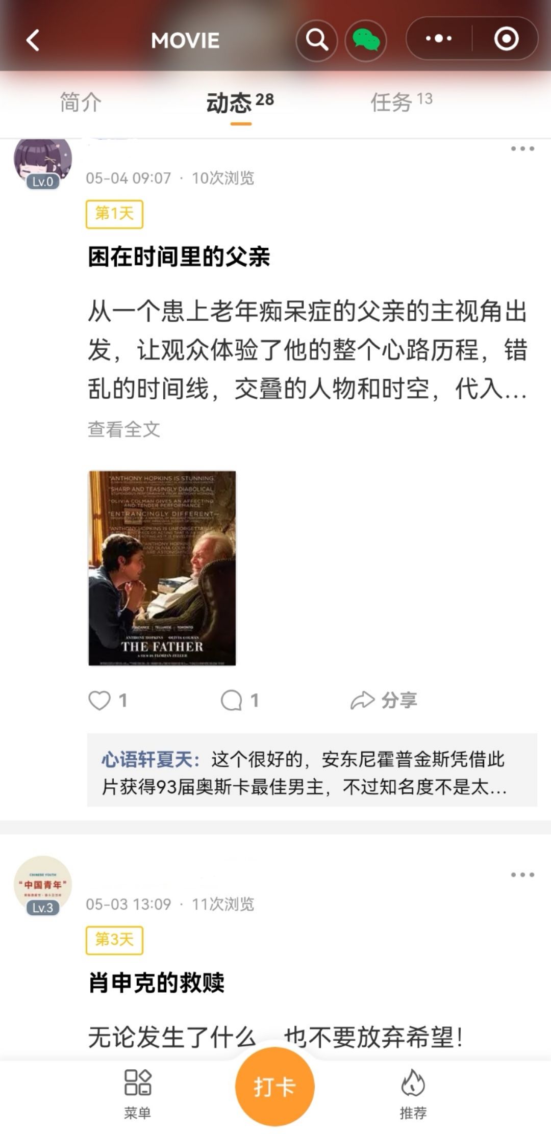 因受疫情影响,本次活动采取线上方式进行,活动展开地点为微信小程序“小打卡”。此次活动打卡分为四个主题,分别是阅读,运动,美食和电影。同学们根据个人喜好选择参加一到四个不等的打卡活动,各个打卡圈会定期发布了集体打卡任务,收集同学们的日常生活动态,同学也会根据个人想法发布自己的打卡内容。