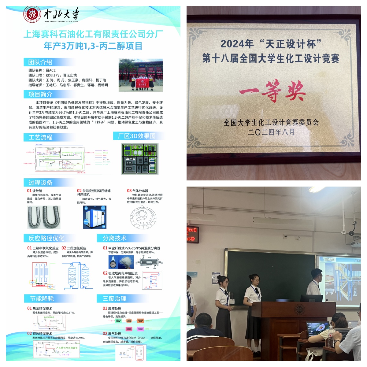 2021级化工专业本科生王涛、焦玉豪、周丹、庞国轩、杨丁瑜5位同学组成)完成的作品——“上海赛科石油化工有限责任公司分厂年产3万吨1,3-丙二醇项目”,在工艺选择、设备设计与选型、自动控制、本质安全、清洁生产、三维工厂等方面开拓创新,精彩的汇报展示与答辩得到了评委的一致认可,历经山西省省赛、西北区赛、全国总决赛,从全国450所高校,3685支队伍中,一路拼搏,最终获得西北赛区特等奖、全国总决赛一等奖,并获西北赛区工程图纸与设计文档优秀奖。这是我校自参加全国大学生化工设计竞赛以来,已连续11年代表西北赛区参加全国总决赛,并获得全国一等奖,这一优异成绩体现了国产大奶