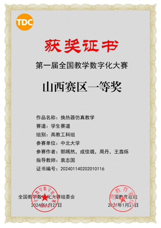 参赛作品——“换热器仿真教学”获得山西赛区一等奖,成功进入决赛。该项目展示了先进的仿真技术与数字课件及现代化教学工具的结合,实现了教学模式与方法的创新,具有优化能效和节能减排效果,激发了学生的自主学习积极性与应用潜力,得到了评委的一致认可。这不仅是对团队成员与指导教师辛勤付出的肯定,也是对我校在科技创新与教育教学融合方面所取得成就的认可。