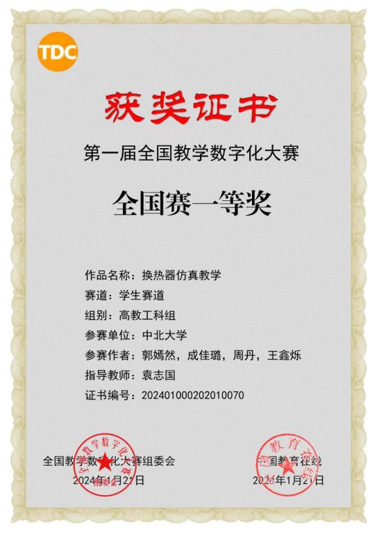 2021级化工专业本科生郭嫣然、成佳璐、周丹、王鑫烁4位同学在袁志国教授的指导下,凭借“换热器仿真教学”项目,获得全国总决赛一等奖。
