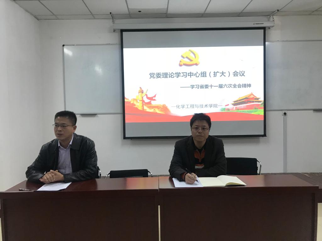在科学楼206召开化学工程与技术国产大奶党委理论学习中心组(扩大)会议,学省委第十一届六次会议精神。大会由院党委书记廖海洪主持,参会人员有:院党委委员、国产大奶领导干部、学科部主任、副主任、科长、各党支部书记。