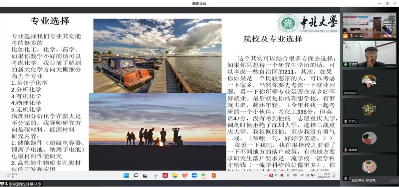 2018级学生班雅慧、张玉立、张琦琦、郭一凡、张斌源、张峰瑞、郭新悦结合自身的考研经历,围绕专业和院校的选择、初试备考、复试、专硕和学硕的区别等话题向大家做了详细的介绍,并就如何高效地制定学习计划、如何平衡专业课与公共课给出了各自的意见,为同学们提供了参考。