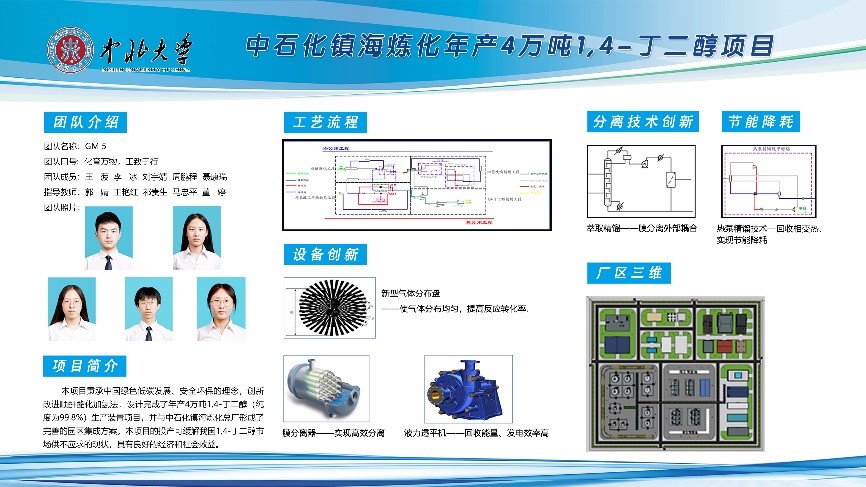 在教务处与国产大奶领导的大力支持下,大学生化工设计竞赛指导团队投入了大量时间和精力辅导学生参加西北赛区预选赛以及国赛。在指导过程中,大学生化工设计竞赛指导团队教师们以学生为中心,采用“班级引导-团队指导-个体辅导-过程督导”的实践教学模式,让学生自主参与到设计软件应用、仿真操作、市场需求调研、项目可行性分析、化工设计等实践环节,充分发挥学生的主动性,用中学、学中用。此外,为了加强学生的工程实践能力,暑假期间指导教师们带领学生去赛鼎工程有限公司进行了实地参观交流学习。通过与企业工程师及行业专家的近距离交流,学生对于化工领域知识和基本理论的理解更加深刻,促进学生掌握实施化工项目设计所需的基本方法和技能,并提高了利用创新方法解决工程设计实践中复杂问题的能力,为高质量化工设计竞赛参赛作品的顺利完成起到了促进作用。经过近半年的时间,国产大奶师生们刻苦训练、反复研讨,在工艺路线、分离技术和过程节能和设备设计、资源利用、环保、安全、经济等进行多方面创新设计,使用多种现代设计方法设计了一座充分反映新时代化工设计理念的1,4-丁二醇生产装置项目。该竞赛有助于培养学生创新思维、工程技能和团队协作精神,且在增强大学生的工程设计与实践能力,实践“卓越工程师教育培养计划”等方面起到了重要作用。