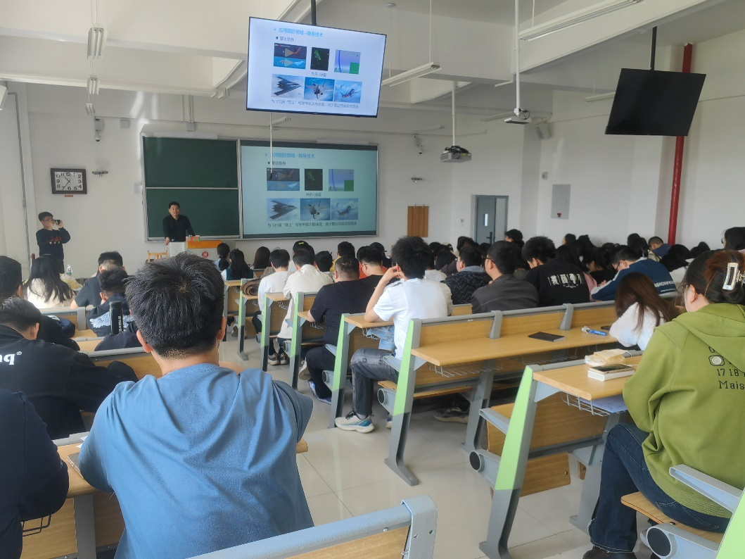 尹老师形象生动地向同学们讲解了电磁功能材料的特性以及应用场景。立足国家重大需求,针对当前吸波暗室建设造价高、耐高温吸波材料稀缺等痛点,尹老师及团队通过长时间钻研探索,研发出一种室温制备的低成本、耐高温暗室吸波材料,并对材料结构进行轻量化,提升应用性能。此外,尹老师与同学们分享了自己的研究心得,勉励同学们要耐的住寂寞,树立信心,坚持不懈,勇于创新和探索,一定能够在科学探究的路上取得成功。