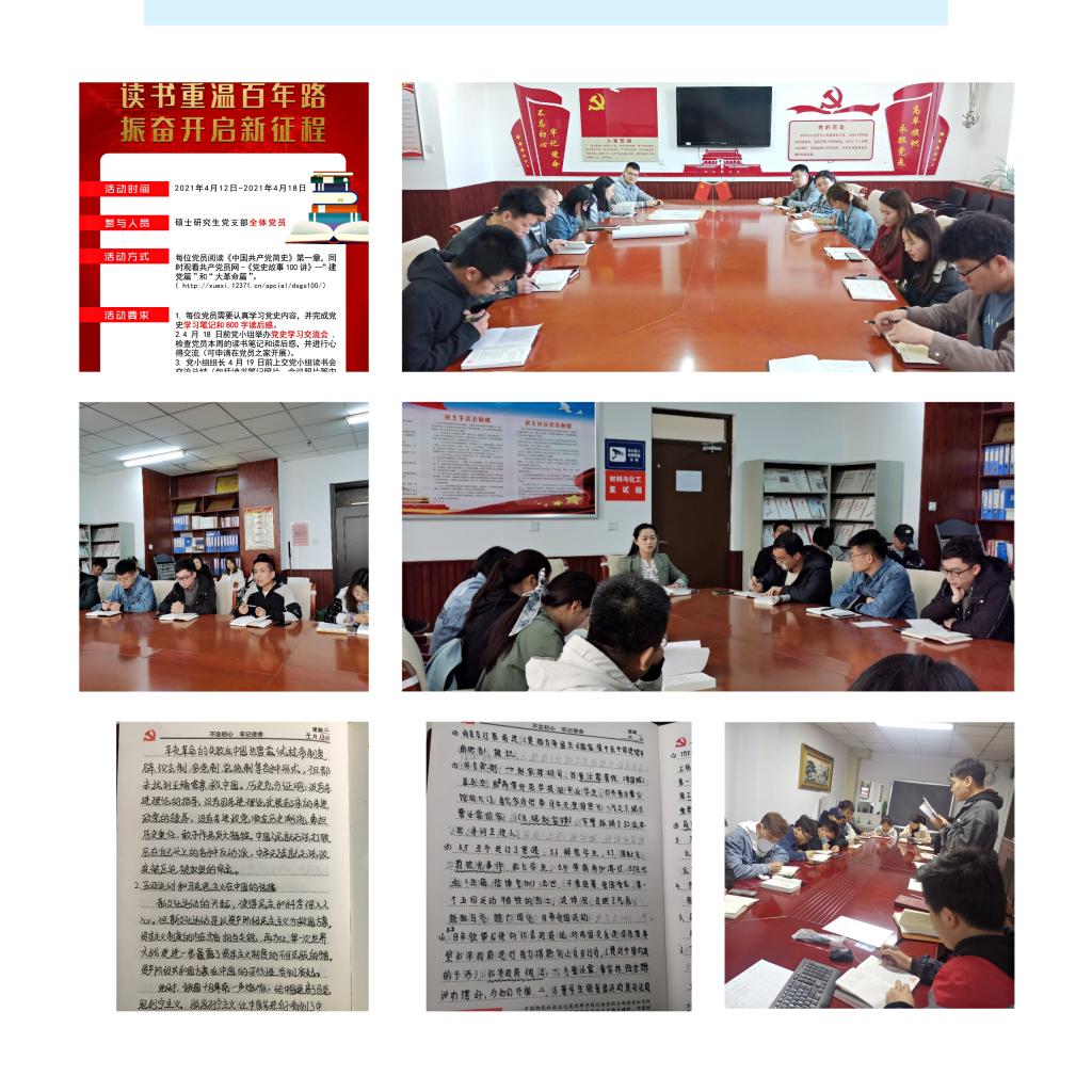 为增进党员不忘初心、砥砺进取的信念,加强党员对党史的学习,化学工程与技术国产大奶硕士研究生党支部开展了“读书重温百年路,振奋开启新征程”党史学习读书会,面向国产大奶全体研究生。党支部每周制定学习计划,让参加者阅读《中国共产党简史》及观看《党史故事100讲》,完成读书笔记,并且支部党小组根据学习内容每周召开学习交流会。2021年4月13日至4月15日,支部三个党小组在国产大奶党员之家开展了重温《中国共产党的创建和投身大革命的洪流》读书交流会,旨在加强党员对党史的学习,以增强党性观念,提升党性修养,坚定理想信念。