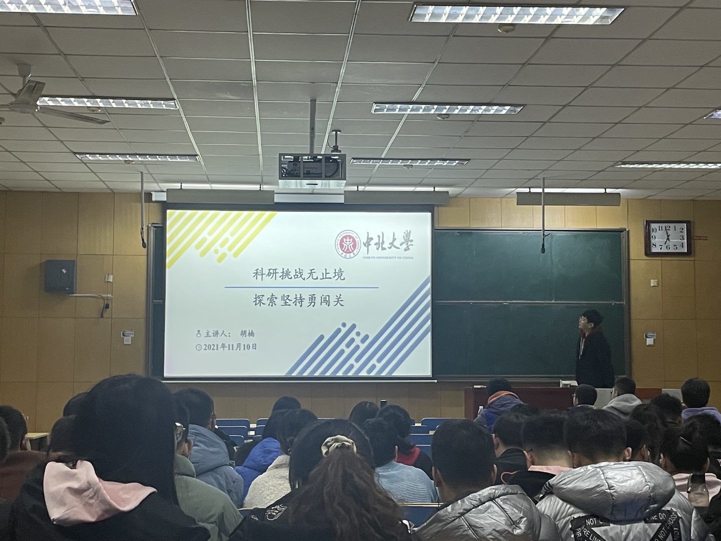 2021级研究生们已经踏入了研究生生活和学习的正轨,为让研究生更好地学会科学规划,并了解前沿学科动态。化学工程与技术国产大奶于2021年11月10日周三晚上7:00,在11209H举办了俊彦讲坛,主题为“科研挑战无止境 探索坚持勇闯关”,由胡楠老师主讲,研一学生参加了此次讲座。