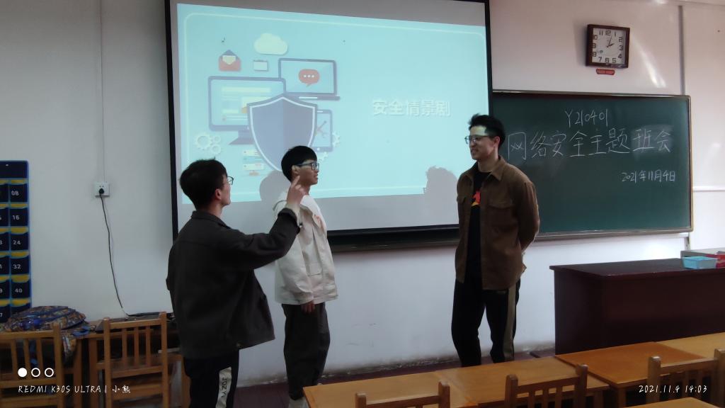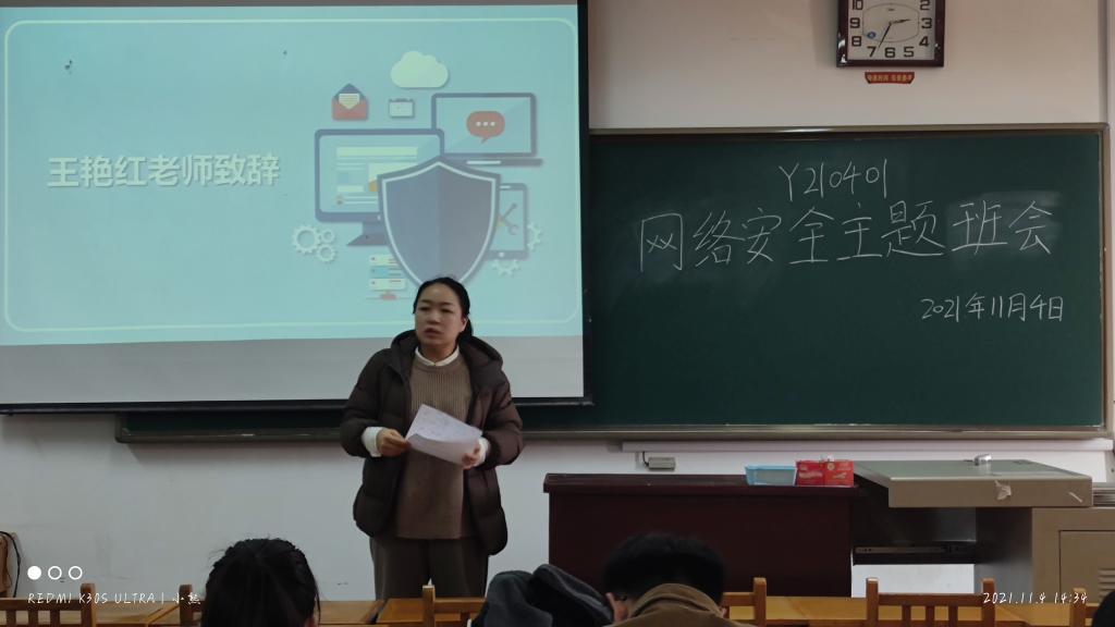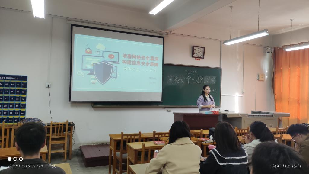 2021年11月4日下午,Y210401班于教室14402Z召开了以网络安全为主题的智慧讲堂。此次会议由崔承珺同学主持,班主任王艳红老师与辅导员贾苗苗老师参会,Y210401班的全体同学到场参加。