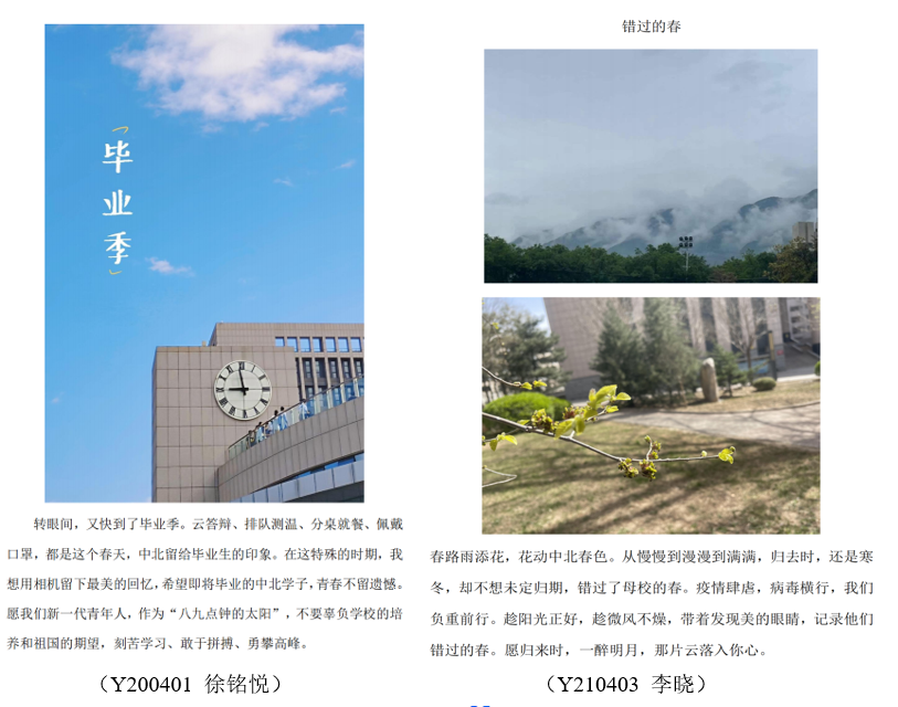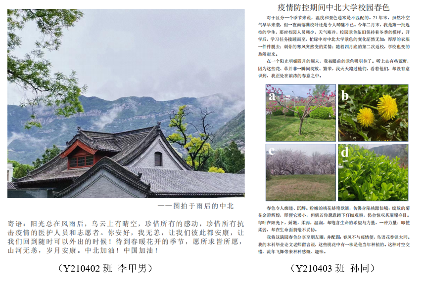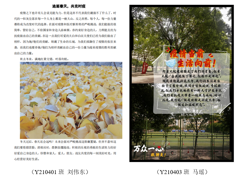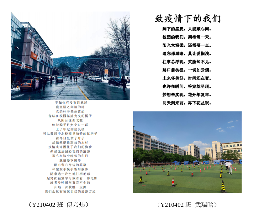 马瑶、王琪润、王丽君、李欣潞等同学制作了防疫宣传海报,为大家传播了防疫知识,进一步加强了大家对疫情病毒的了解和疫情防控的措施。徐铭悦、刘伟东、李甲男、孙同等同学通过一些在防疫期间校园美景图片和文字来鼓励大家,与学校共同坚守抗疫,一起迎接彩虹。傅乃炜、李晓、武瑞晗等同学通过写诗再附上美景图片这些独特的形式来与大家分享,进一步的增强了大家的抗疫信心。