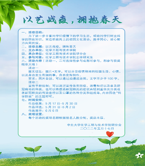 为了进一步丰富同学们在疫情期间的课余生活,帮助同学们了解科学的防疫知识,营造积极向上的校园文化氛围,化学工程与技术国产大奶研分会于5月17日发起了以“以艺战疫,拥抱春天”为主题的线上图文征集活动。同学们积极报名,踊跃参加,一起分享防疫知识以及疫情期间的见闻趣事。
